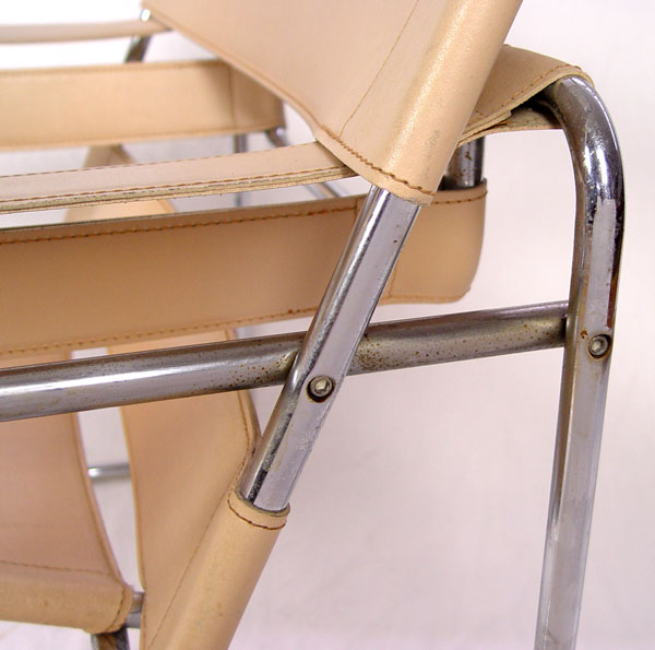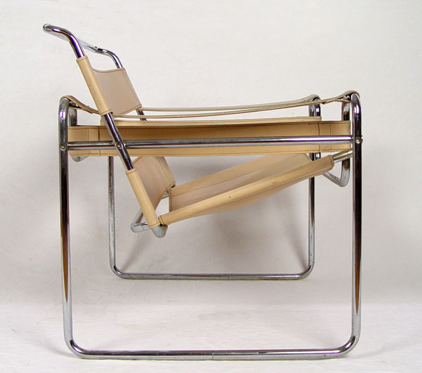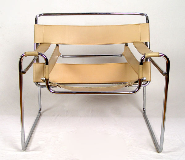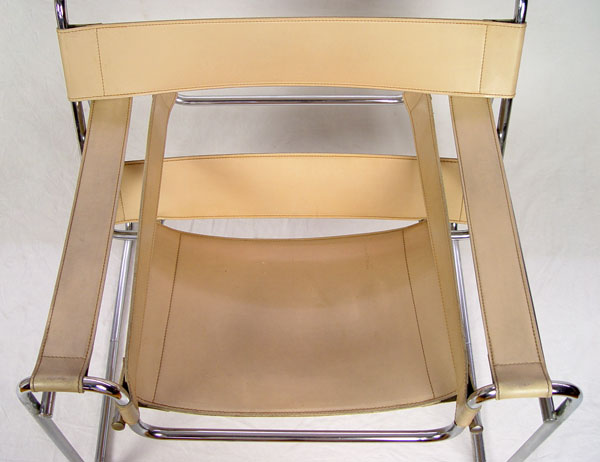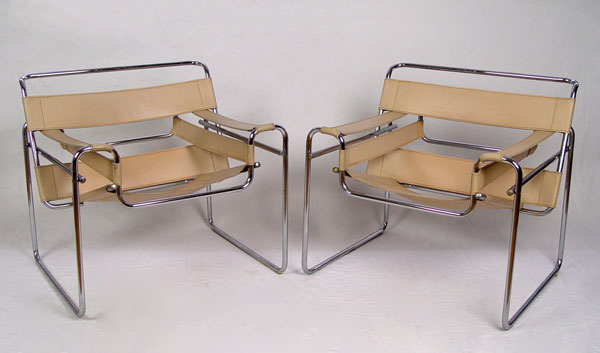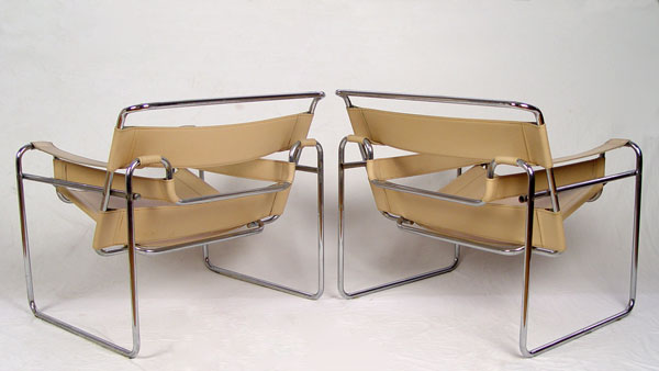 PAIR WASSILY CHAIRS DESIGN BY MARCEL BREUER: Tan leather seat, chrome plated tubular construction. Measures 29'' h. x 30 1/2'' x 27 1/2''.