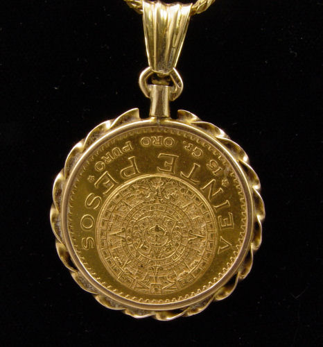20 PESO MEXICAN GOLD COIN PENDANT WITH CHAIN: Gold coin dated 1959. The chain is an Italian 14K snake chain, 18'' long, 7.5 grams. Total weight 26.6 grams.