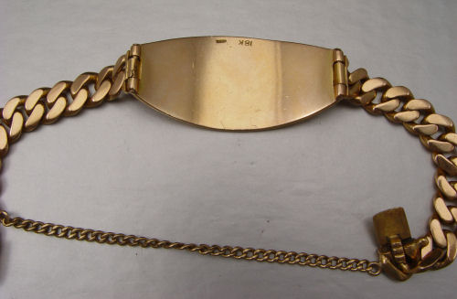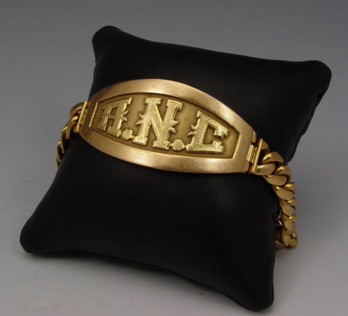 18K YELLOW GOLD GENTS HEAVY BRACELET: 60.9 grams, 14K yellow cold Cuban link ID bracelet. Initials ANC. Assayed and stamped 18K. Safety clasp and chain, 7 3/4''l.