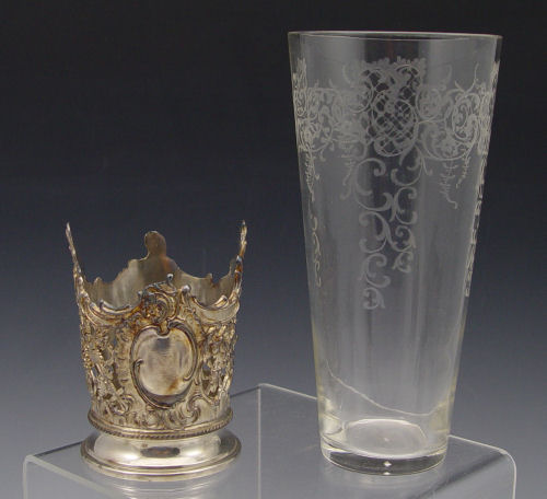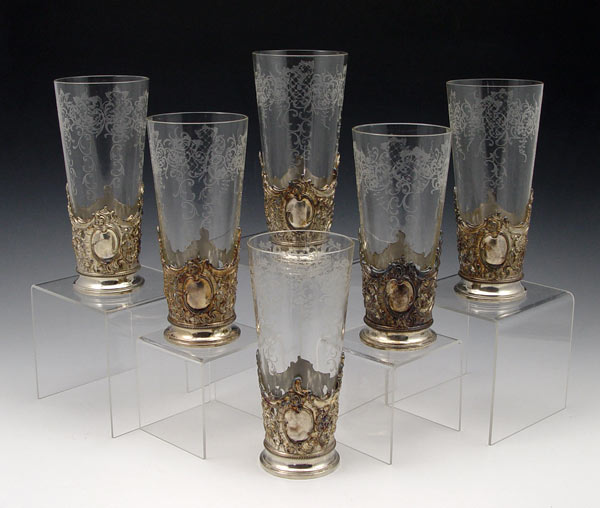 6 WMF SLIVERPLATE AND ETCHED GLASS TUMBLERS: Grapevine and trellis design WMF holders with tall tapered etched glass tumblers. 6 5/8'' tall.