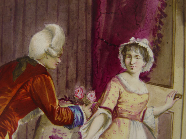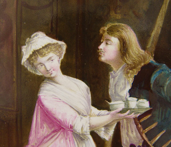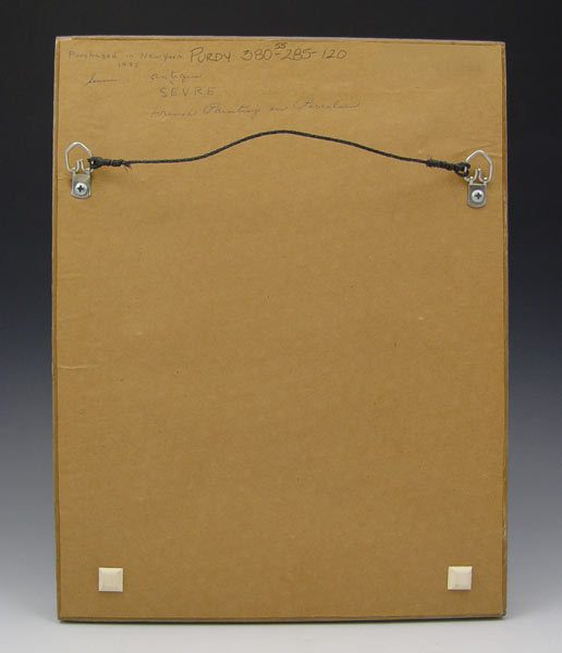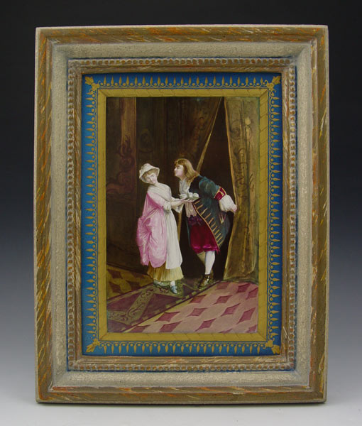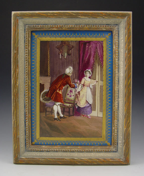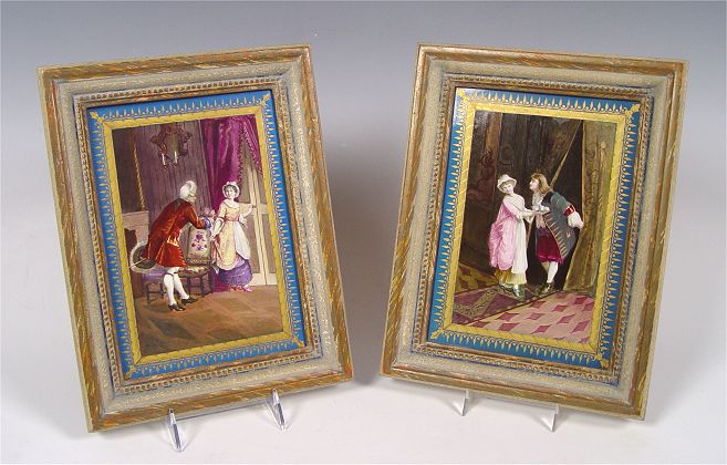 PAIR FRENCH PORCELAIN HAND PAINTED PLAQUES attrib. SEVRES: Unsigned. Wood frame. 2 scenes of gentleman courting ladies. Sight size 9 3/8'' x 6 7/8''. Framed 12 1/2'' x 9 3/4''.