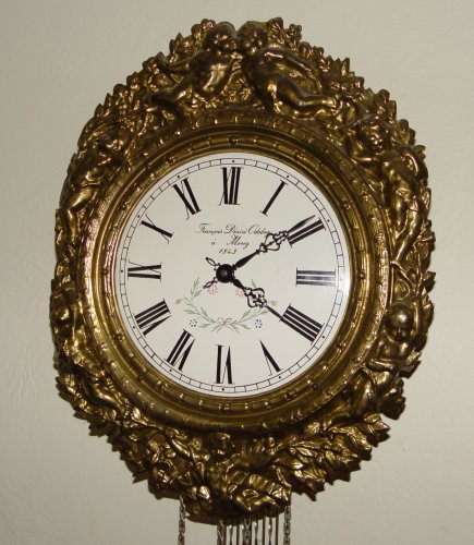 DECORATIVE FRENCH STYLE WAG ON THE WALL CLOCK: Decorative example of this unique clock. Embossed frame with putti and floral decoration. Face reads Francois Desire Odobez a Morez 1843, please note this is not indicative of date of manufacture. Top measures 19'' h. x 15'' x 6''. Pendulum 42'' x 11''