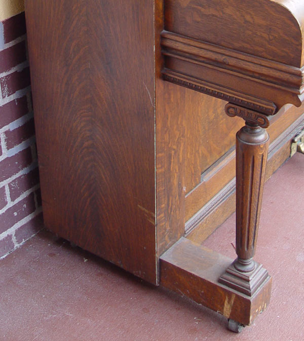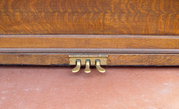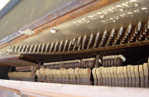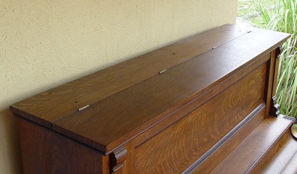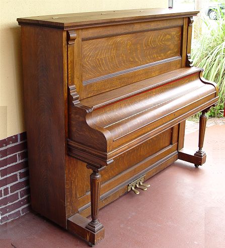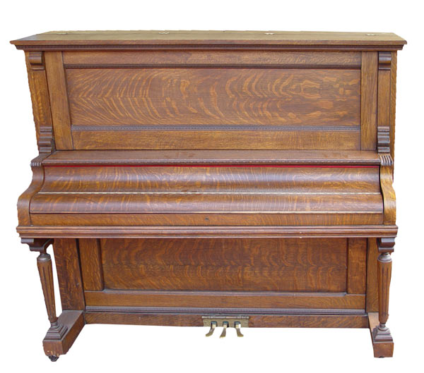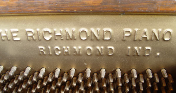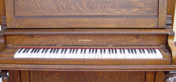 RICHMOND PIANO CO. TIGER OAK UPRIGHT PIANO: Manufactured by The Richmond Piano Co. Richmond Indiana. Serial number 79123 on back of tiger oak case. Measures 56 1/2'' h. x 64 1/2'' x 27 1/2''