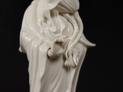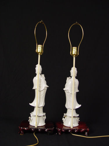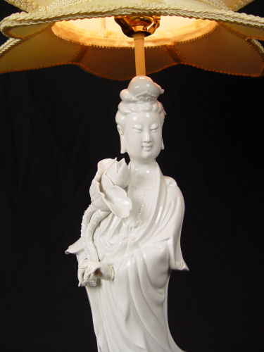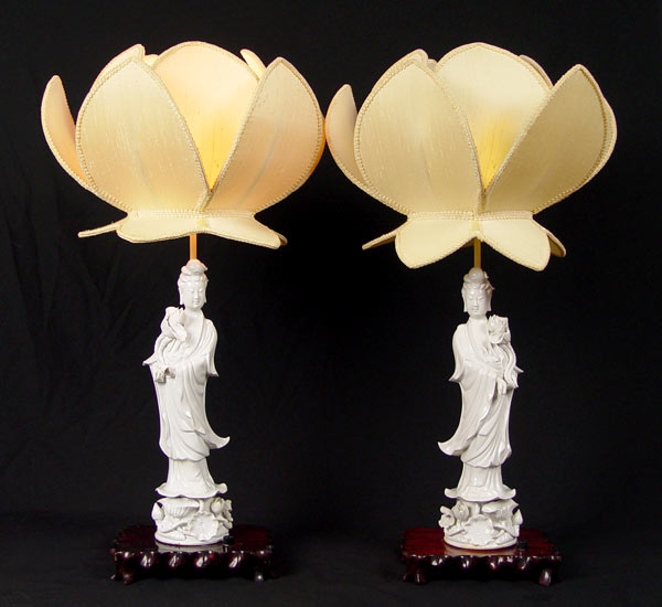 PAIR BLANC DE CHINE QUAN YIN PORCELAIN LAMPS: Most unusual lotus flower form shade. Lamps are approx. 31''h. overall, porcelain is 17''.