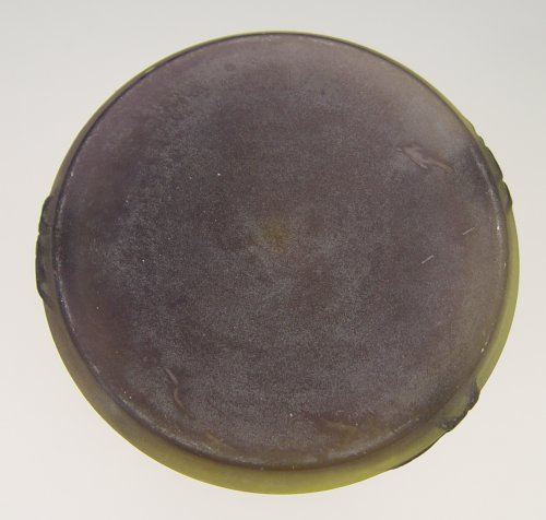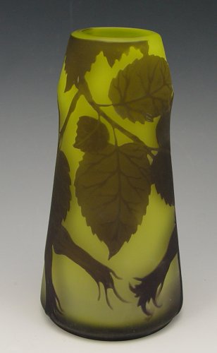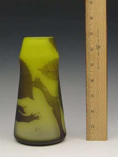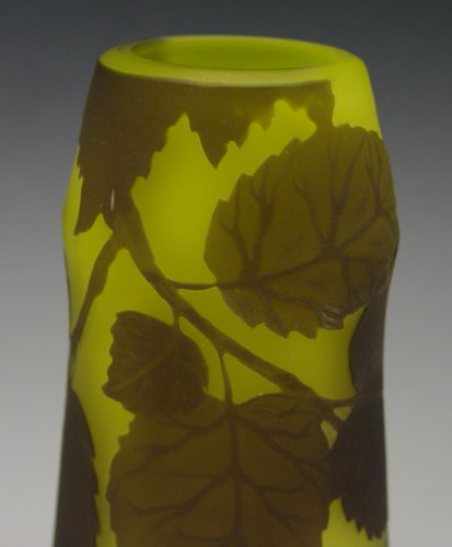 RICHARD CAMEO GLASS: Carved dark green on lighter green, leaf design. Signed in cameo. 6 1/2'' tall.