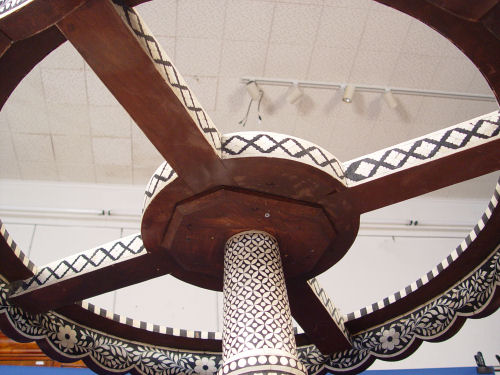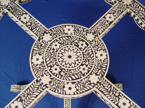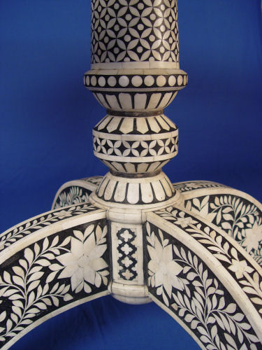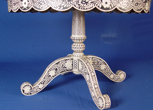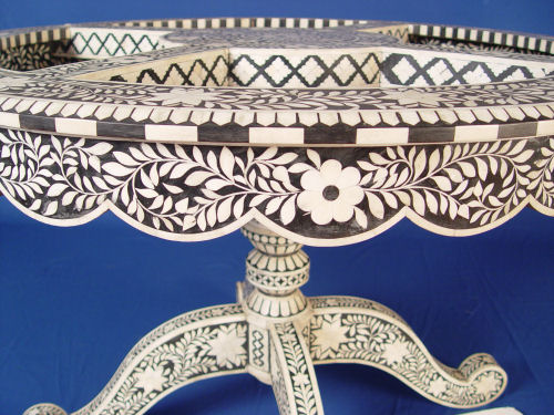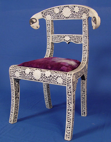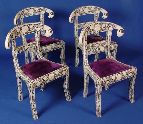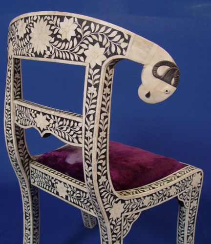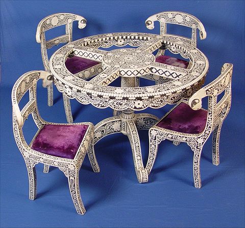 EGYPTIAN BONE INLAY RAMS HEAD CHAIRS AND PEDESTAL TABLE: Round table with scallop rim, pedestal base joins to 4 legs. 32''h. x 48'' dia. There are 4 chairs with the crests ending in figural rams heads, 35 1/2'' x 25''.