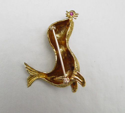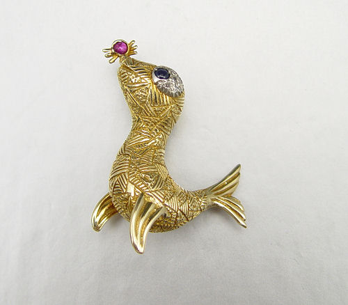 18K FIGURAL SEA LION OR SEAL BROOCH: 18K yellow gold brooch depicts a stylized sea lion. Created with 5 round single cut diamonds. Diamond weight approx. .05 Ct. There is also a an approx. .10 Ct. round cabochon cut sapphire and approx. .10 Ct. round cabochon cut ruby. Textured body. Bar pin closure. Well made, signed JK. 1 3/4''. Weight: 15.4 grams