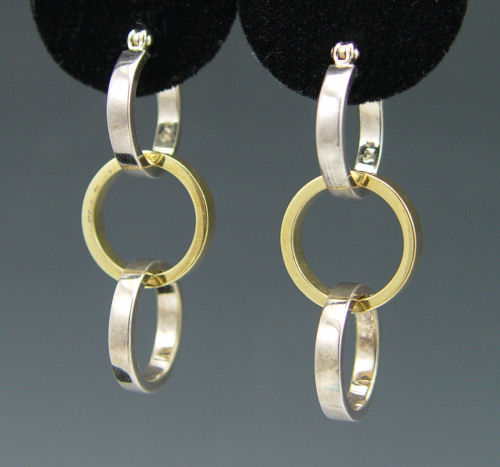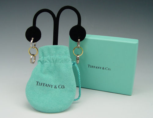 TIFFANY & CO PALOMA PICASSO EARRINGS: 18K yellow gold and sterling silver hoop earrings with removable double circle pendants. Signed Tiffany & Co. Paloma Picasso design. Weight: 3.3 grams of 18K 6.6 grams of silver.