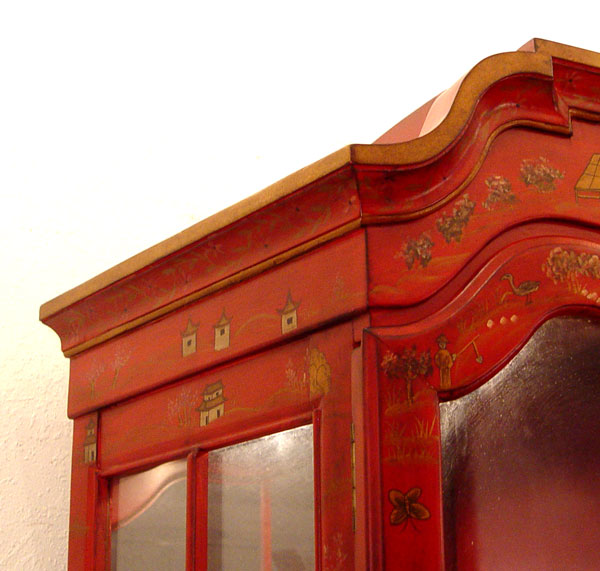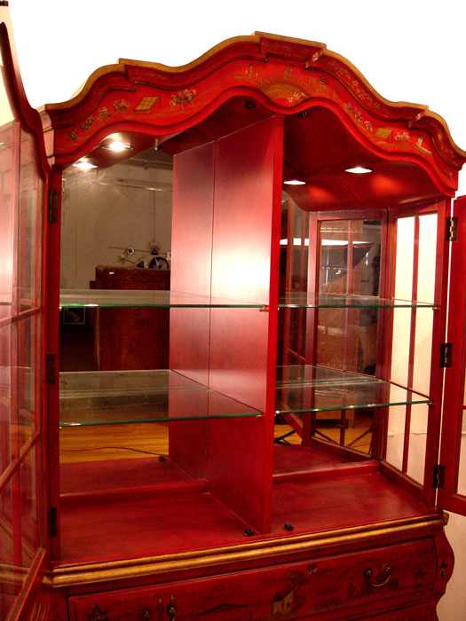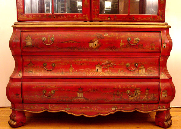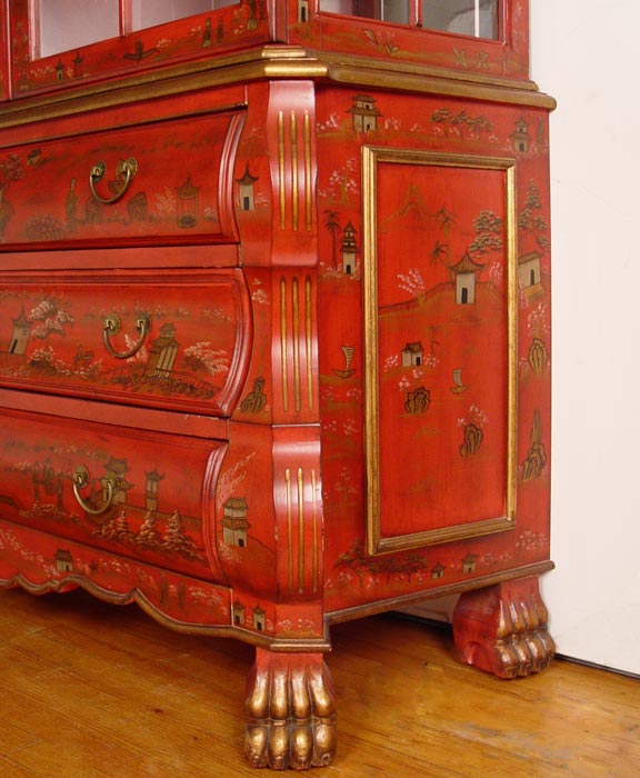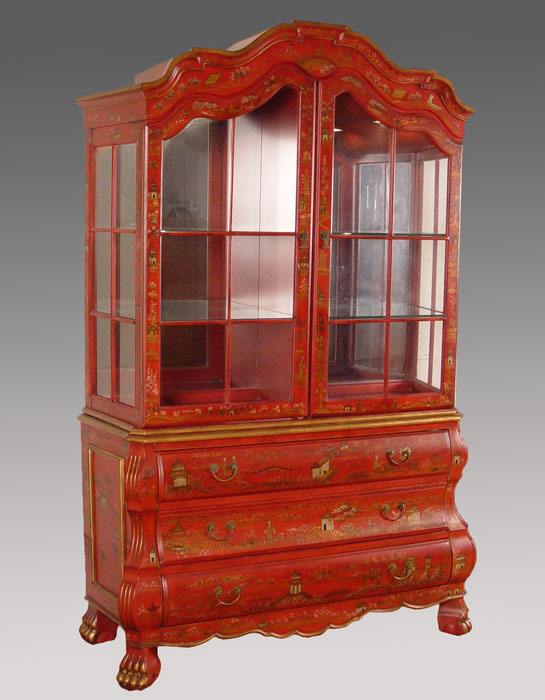 RED CHINOISERIE PAINT DECORATED BOMBAY CABINET BY LEXINGTON: 2 parts. Upper with mirror back, illuminated and glass shelf interior. Base has three drawers, claw feet. 87 3/4'' h x 57'' x 20 1/2''.