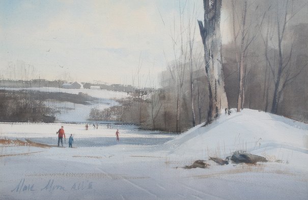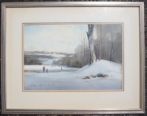MOON, Marc, (American, 20th C.): Winter Landscape with Skaters, Watercolor, sight size 14'' x 21 1/2'', frame 24 1/2'' x 32''.