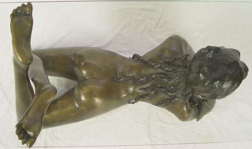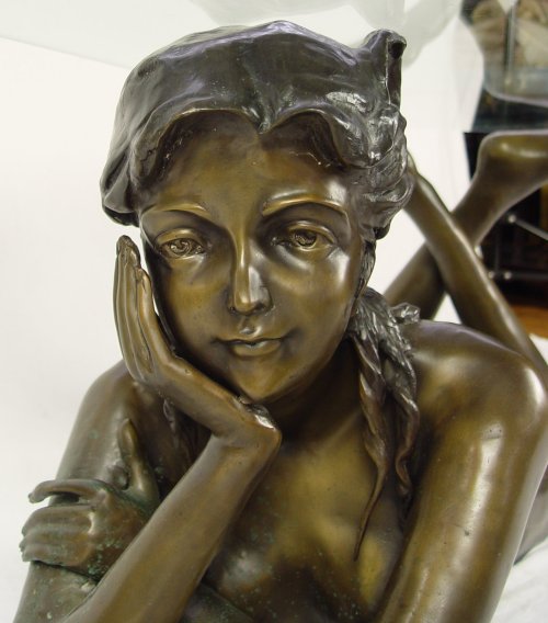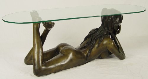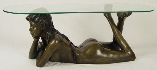 BRONZE NUDE FIGURAL COCKTAIL TABLE: Glass top over bronze figure. Contemporary. Nude measures 17'' h. x 36'' x 18''. Glass top measures 48'' x 17 7/8''