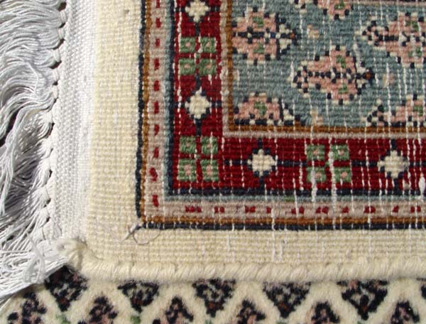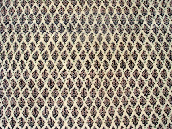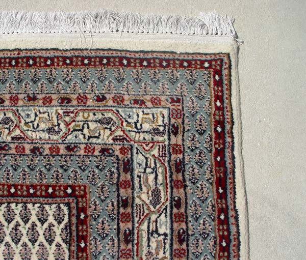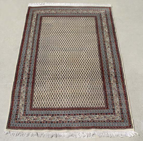 HAND TIED ORIENTAL RUG: Repeating geometric pattern, ivory ground. Approx. 8' 8 1/2'' x 5' 7''