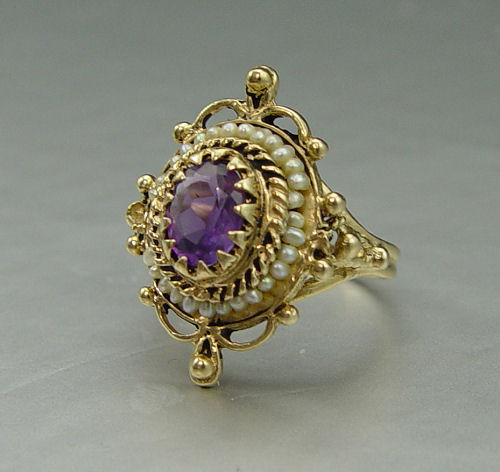 14K AMETHYST & SEED PEARL RING: 14K yellow gold ring contains one oval mixed cut amethyst. Weight: 1.00 Ct. Approx. Seed pearls circle the amethyst. Approx. 4 seed pearls are missing. The amethyst is prong set. The pearls are wire strung. Weight: 6.7 grams. Size: 7