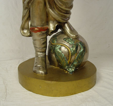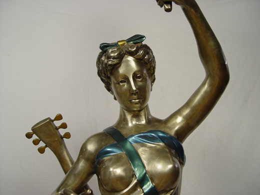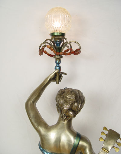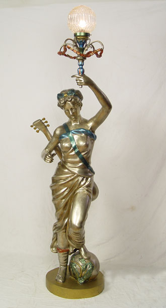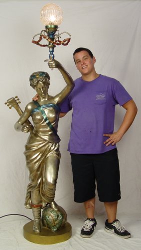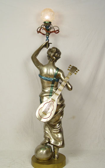 LIFE SIZE FIGURAL FLOOR LAMP: Bronzed and painted metal figure of Greek woman with guitar. Please see mate to this lamp previous lot. Approx. 79'' h x 28'' x 28''