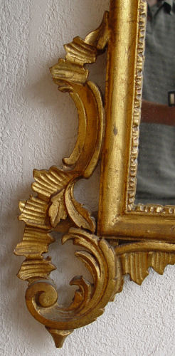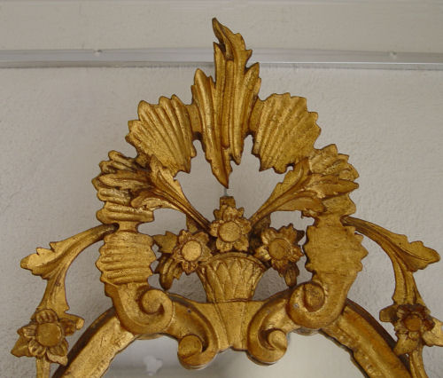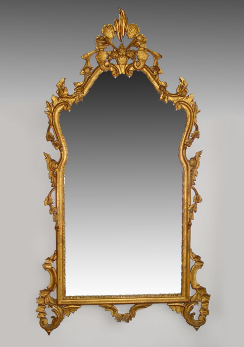 ROCOCO STYLE GOLD GILT WOOD MIRROR: Floral filled basket bonnet top with leaf & floral carvings. 54'' x 28 1/2''
