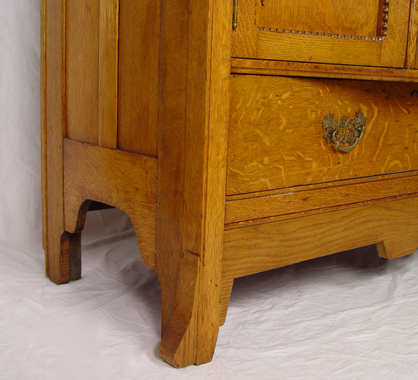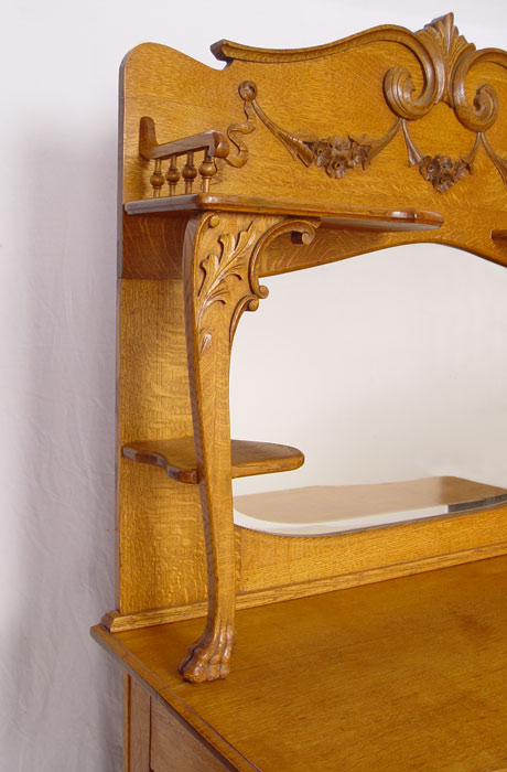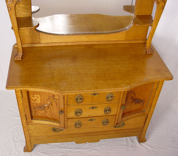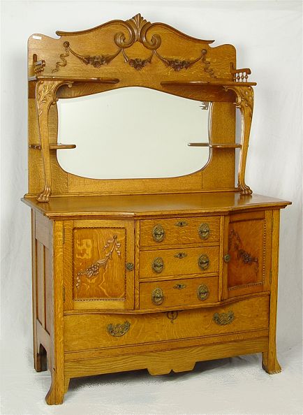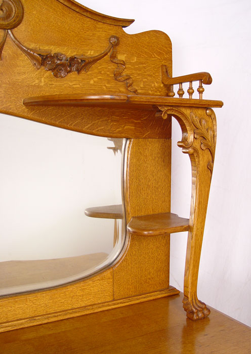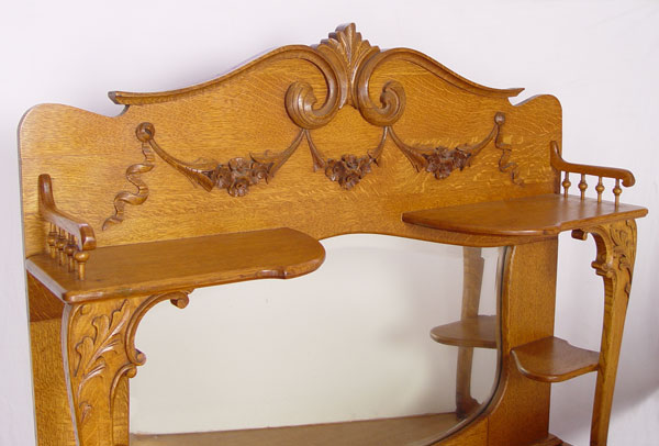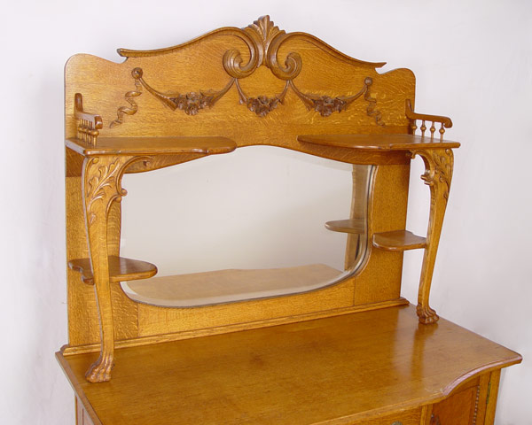 LATE VICTORIAN AMERICAN GOLDEN OAK MIRROR BACK SIDEBOARD: Unusual block front. Measures approx 75'' h. x 50 1/4'' x 24''