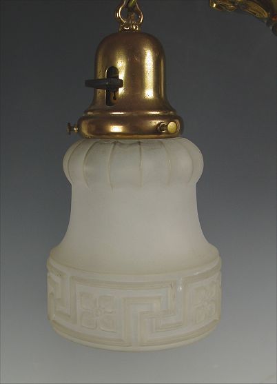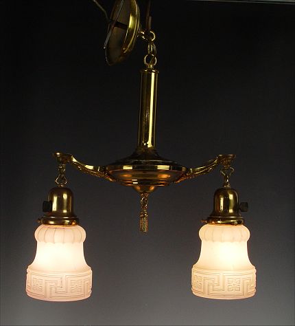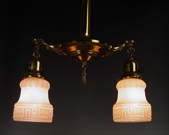VICTORIAN TWO LIGHT CHANDELIER: Brass tassel hangs between a pair of Greek Key motif frosted glass shades. Approx. 16'' wide, hangs 21'' with chain.