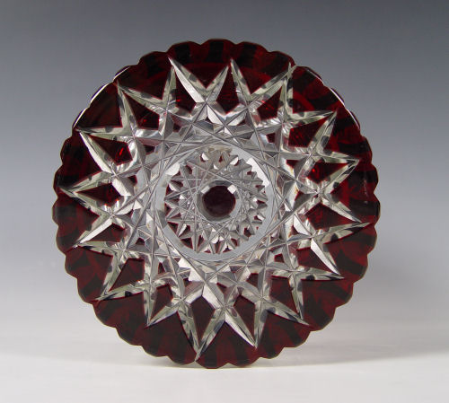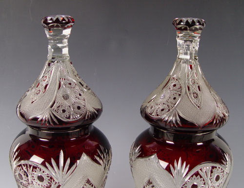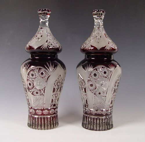 PAIR BOHEMIAN GLASS RUBY CUT TO CLEAR TALL COVERED VASES: 21'' tall.