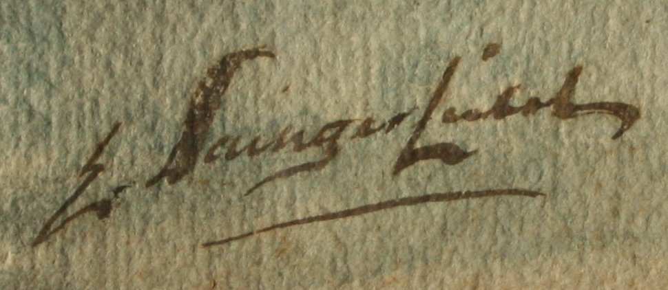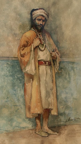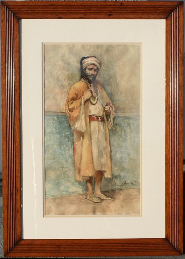 WATERCOLOR OF MIDDLE EASTERN MAN IN OAK FRAME: Illegibly signed, 23'' x 12 3/4'' sight size, antique frame measures 34 1/2'' x 24 1/2''.