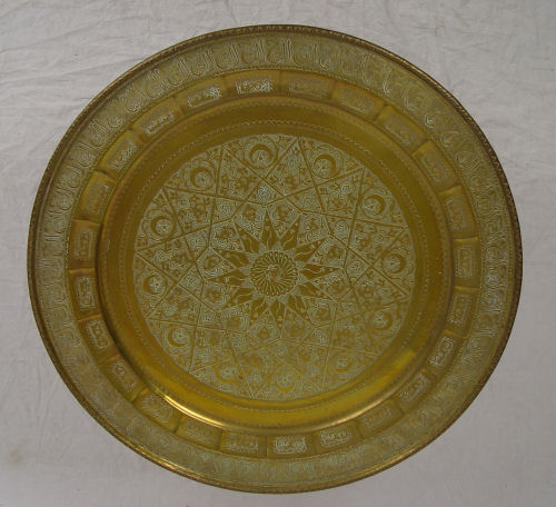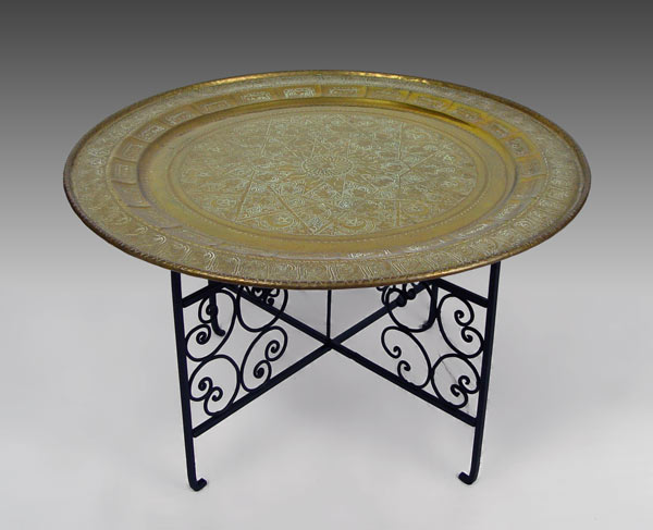 LARGE TURKISH TOOLED BRASS CHARGER: Hang on wall or use with folding black iron stand and glass to form a table. 37'' dia.