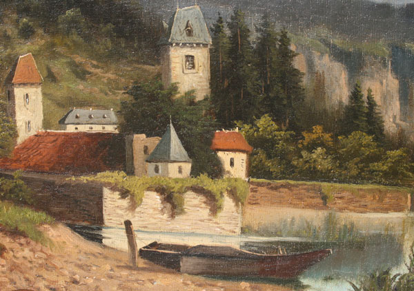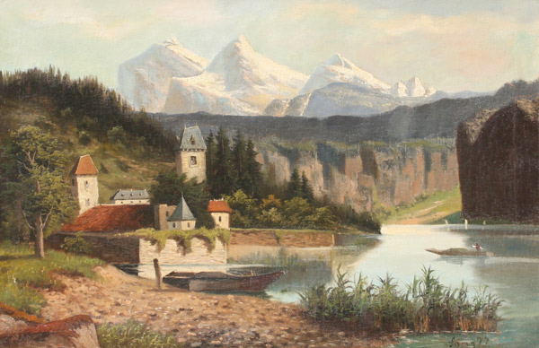 ALPINE LAKESIDE SCENE SIGNED LANZ: OIL/Canvas, 18'' x 26'', framed, 22'' x 30''.
