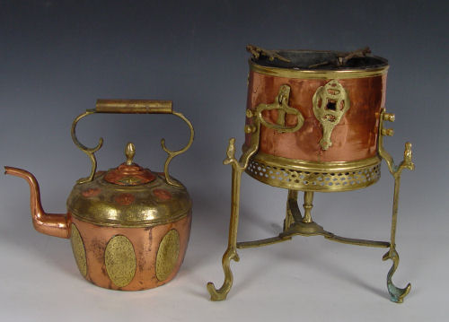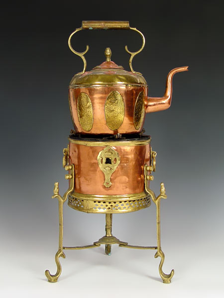 EARLY BRASS AND COPPER KETTLE ON STAND: Possibly Dutch, 26'' tall overall.