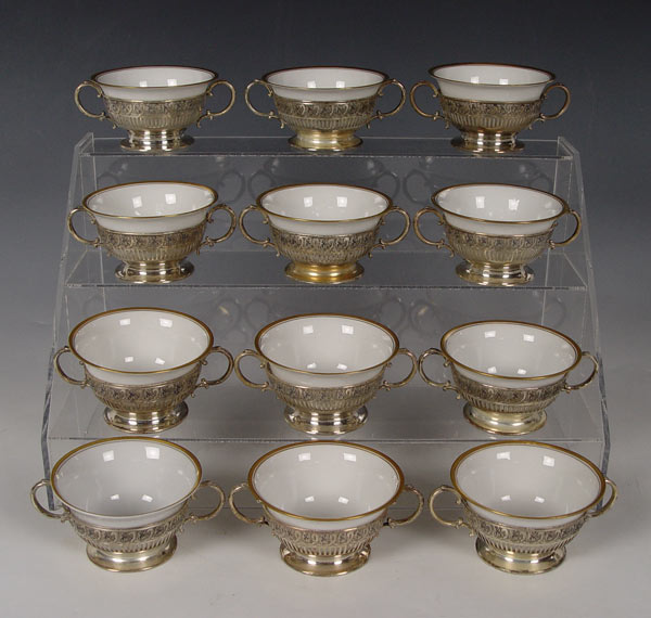 12 STERLING CREAM SOUP CUP HOLDERS WITH LIMOGES CHINA INSERTS: Whiting sterling reticulated double handle cup holders (One sterling holder is a replacement). Limoges and Bavarian fine china inserts in matching gold rim borders.
