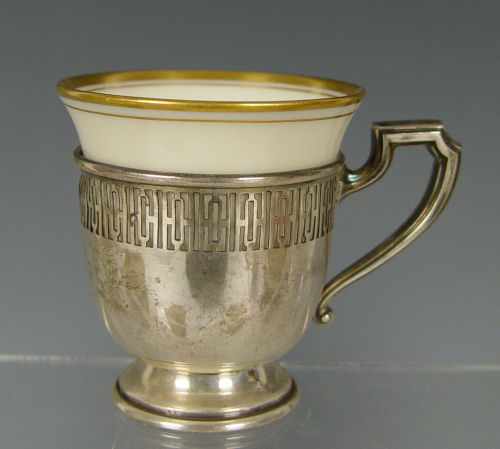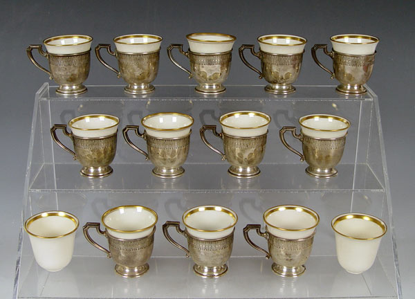 12 LENOX & STERLING DEMITASSE CUPS: Set of 12 sterling demitasse cup holders with Lenox inserts. Sold with 2 additional spare inserts. 2 1/2'' h. x 3 1/4''.