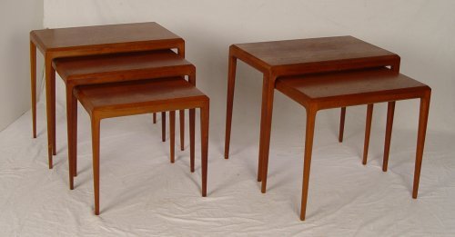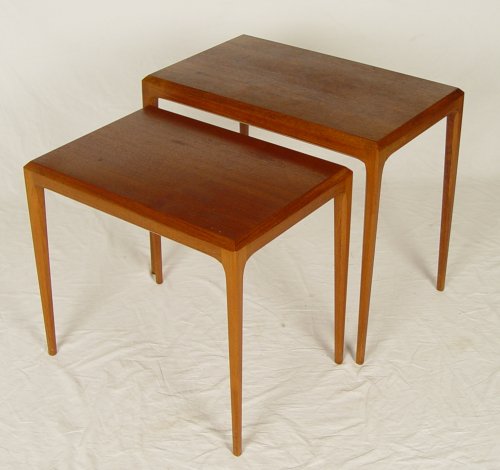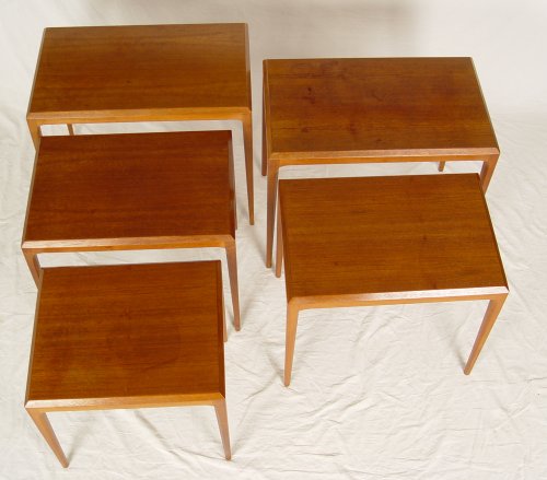 5 SILKEBORG DANISH MODERN NESTING TEAK TABLES: Set of 3 and set of 2 graduated nesting tables. Silkeborg Danish label on smallest table. Largest measures 20 1/2'' h. x 23 1/4'' x 14''