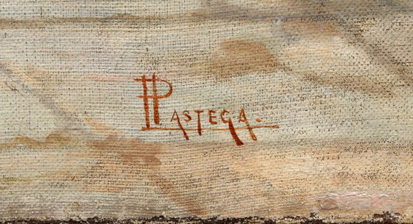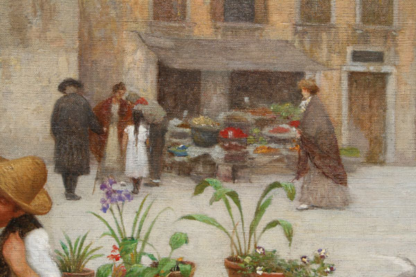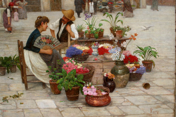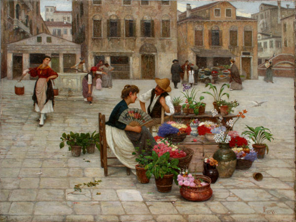 PASTEGA, Luigi, (Italian, 1858-1927): Courtyard Scene with Flower Sellers And Figures, OIL/Canvas 23 1/2'' x 30 1/2'', unframed, signed lower right.