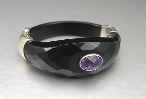 STERLING ONYX & AMETHYST BANGLE: Bangle is constructed of two solid black onyx pieces with sterling findings. The top piece of onyx is faceted. Bezel set in the center is a faceted oval cabochon shaped amethyst. Weight: 3.50 Ct. Approx. The amethyst is rated SI in clarity, P in Hue, 2 in Tone and 2 in Saturation. The amethyst is foil backed.