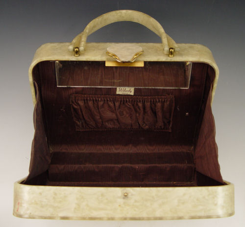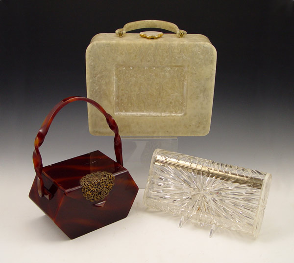 3 VINTAGE PLASTIC PURSES: 1) Wilardy tortoise shell lucite with filigree metal clasp and twist handle. Please note surface scratching. 2) Clear Lucite book shape clutch, 9 1/2'' length. 3) Large Wilardy Original pearlescent purse, 8'' x 10 1/2''. Note loss of decorative plaques.