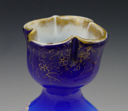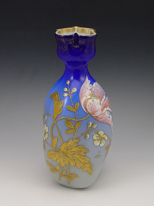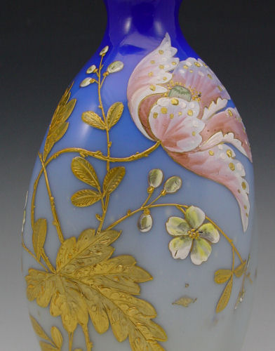 FRENCH ENAMEL ART GLASS VASE: Possibly Mont Joye. Cobalt fading to the lightest blue, cased in white. Heavy in enamel and gold decoration. 10''h.