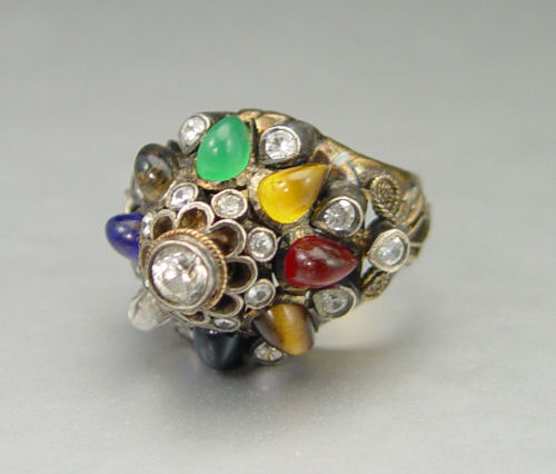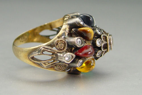 14K & STERLING GEMSTONE PRINCESS RING: 14K yellow gold & sterling ring contains synthetic gemstones. The stones are bezel set. Weight: 10.4 grams. Size: 9