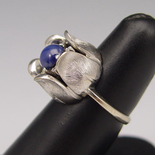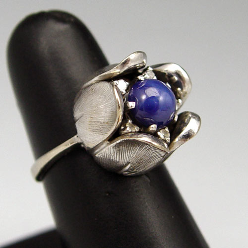RETRO STAR SAPPHIRE & DIAMOND RING: 14K white gold ring contains one round cabochon cut synthetic star sapphire. Weight: 2.00 Ct. Approx. Five round single cut diamonds. Weight: .08 Ct. Approx. Rated SI in clarity and I-J in color. The sapphire and diamonds are prong set. Weight: 9.4 grams. Size: 6.5