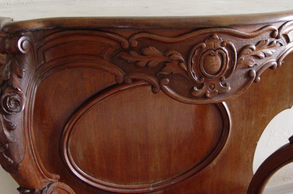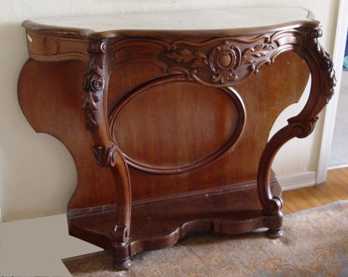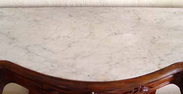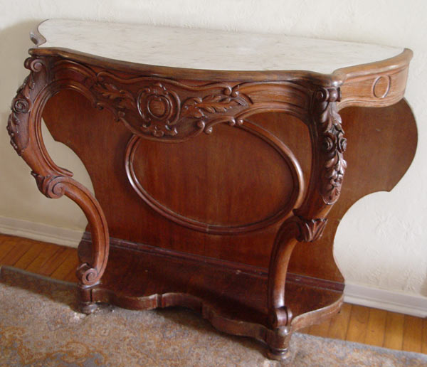 VICTORIAN CARVED WALNUT MARBLE TOP FOYER TABLE: Sculpted white marble top over table finely carved in roses, leaves and medallions. Lower shelf and bun feet. Shows normal wear for a table of this age. Measures 35'' h x 45 x 18''