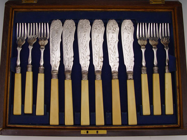 MAPPIN & WEBB SILVERPLATE FISH SET: Service for 6, ivory appearance celluloid handles. 6 forks ( 7 3/4''), 6 knives (9''). Comes in original Mappin & Webb case 3 1/2'' x 14 1/2'' x 10 3/4''. CONDITION: Note condition of case, split on one fork handle