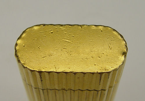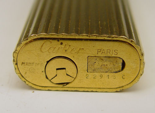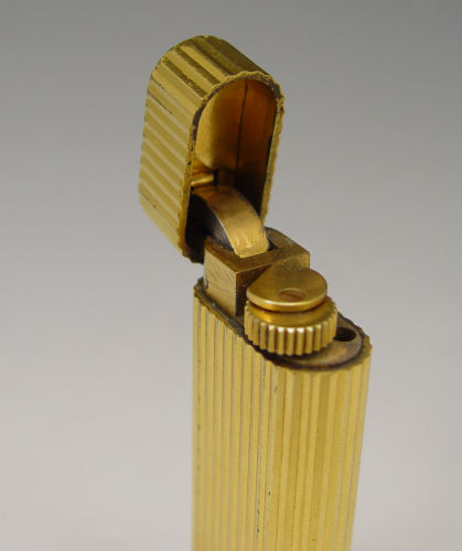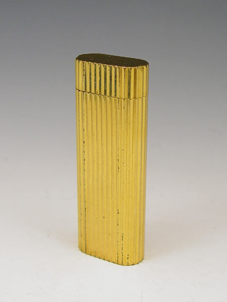 GOLD TONED CARTIER LIGHTER: Reeded gold toned case. Signed Cartier Paris and numbered. 2 3/4'' long.