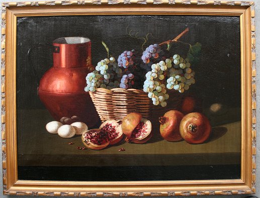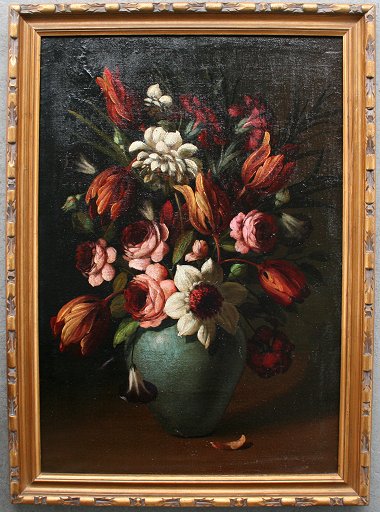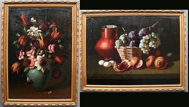 2 DECORATIVE STILL LIFE PAINTINGS: 1) Flowers in vase, Oil/Canvas, 28 1/2'' x 19 3/4'', framed, 33'' x 23 1/2''; 2) Flowers and fruit, Oil/Canvas, 20'' x 24'', framed, 24'' x 28''.