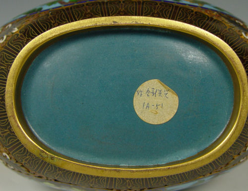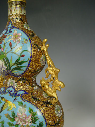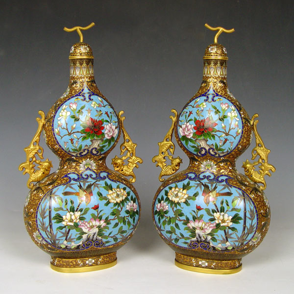 PAIR CHINESE CLOISONNE COVERED JARS: Double gourd form, gilt metal handles and finial. Floral and bird design on blue ground. 16'' tall, 8'' at the widest point.