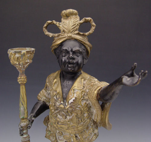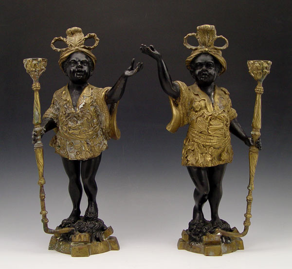 PAIR CONTEMPORARY BRONZE FIGURAL BLACKAMOOR CANDLE HOLDERS: Each holds single candle. 15 1/4'' h x 9''.