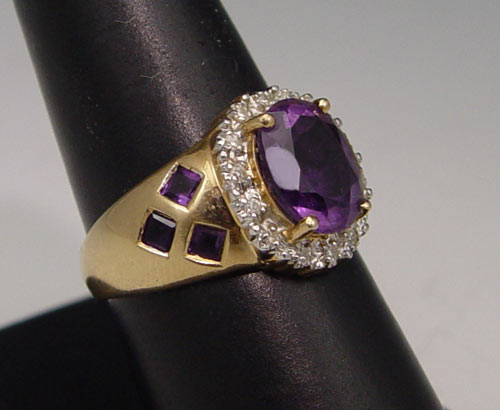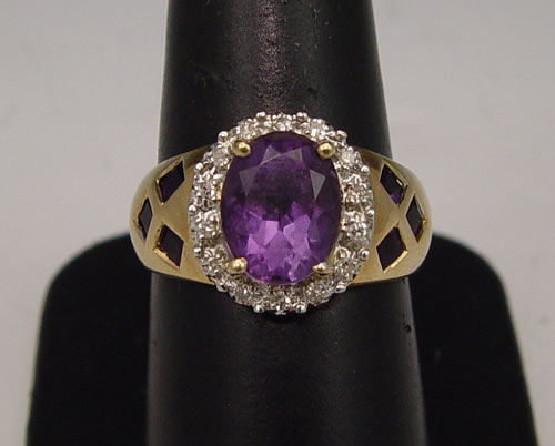 14K AMETHYST & DIAMOND RING: 14K yellow gold ring centers one oval mixed cut amethyst framed in diamonds with six square calibré cut amethysts in the shank. Amethyst total weight is approx. 2.00 Ct. Fourteen round single cut diamonds total weight approx. .25 Ct. Rated SI in clarity and I-J in color. The amethyst and diamonds are prong set. Weight: 5.1 Size: 8