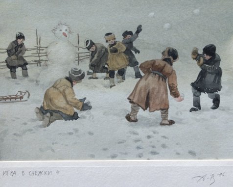 RUSSIAN SNOWBALL FIGHT: Watercolor, 4'' x 5 3/4'', illegibly signed and dated, framed, 9 1/2'' x 12 1/2''.
