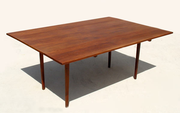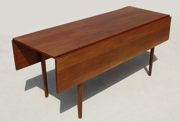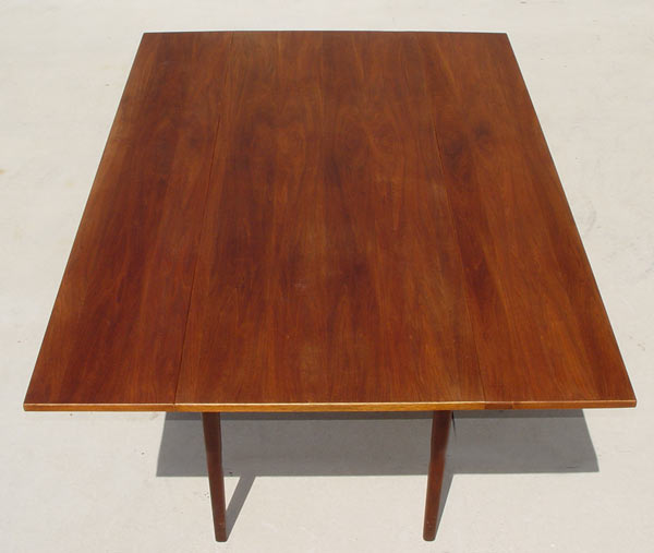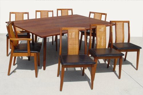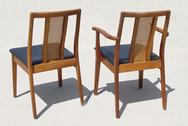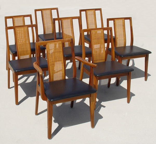 DANISH MODERN STYLE DINING TABLE WITH 8 CHAIRS: Cane back chairs, drop leaf table. Table measures 29'' h. x 72'' x 48'' fully extended. 1 arm, 7 side chairs. Arm measures 33 1/8'' x 21 1/2'' x 18''