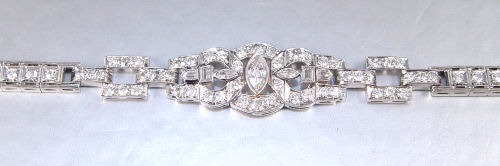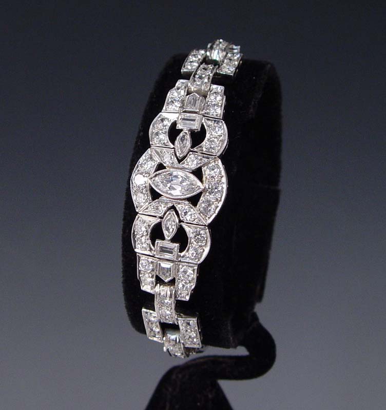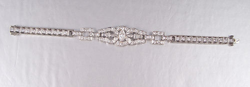PLATINUM RETRO DECO DIAMOND BELLY BRACELET: Platinum bracelet contains seventy two round full cut and European cut diamonds, three marquise cut diamonds, two straight baguette cut diamonds and two trapeze cut diamonds. Weight: 3.55 Ct. Approx. The diamonds average VS in clarity and G-H in color. The diamonds are bead and bezel set. Locking closure with hidden hinged safety clasp. Weight: 18.9 grams. Length: 6 1/4'' Circa: 1930's