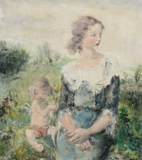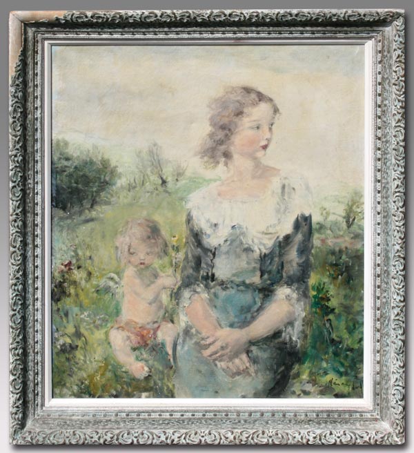 NARAY, Aurel, (Hungarian, 1883-1948): Mother & Child, OIL/Canvas 26'' x 22'', framed with missing gesso 31'' x 27''.