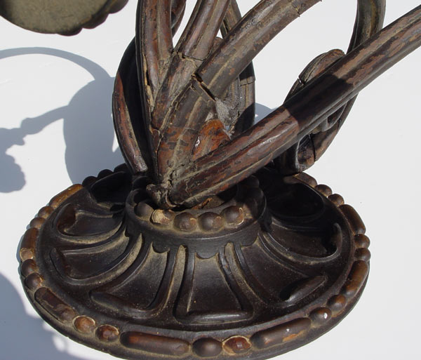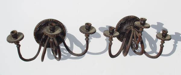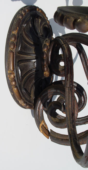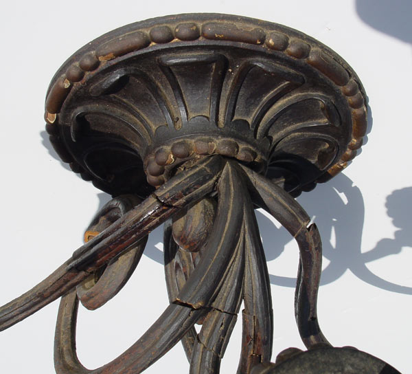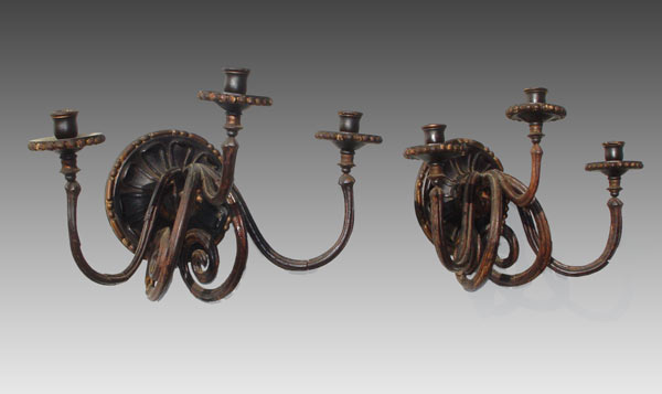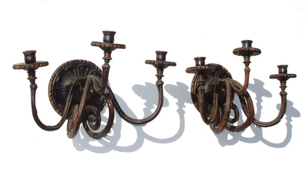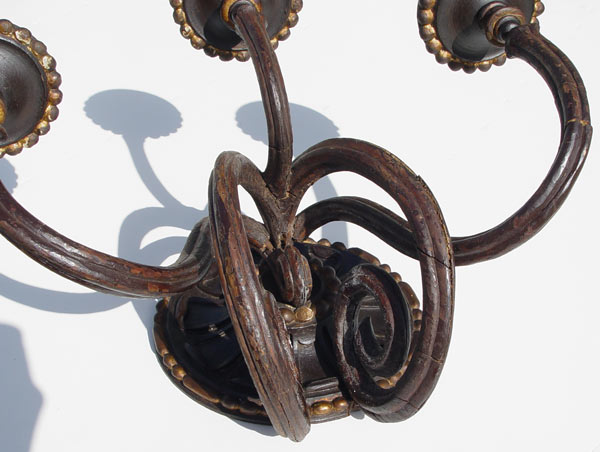 18th C CARVED WOOD SCONCES: Three light scroll and ball wall mount sconces. With some reglue and restoration work. 17''h. x 13'' wide x 10 1/4'' deep.
