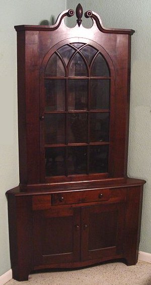 WALNUT CORNER CUPBOARD: Arched glass door under traditional broken swan neck pediment. Single drawer over base doors. Approx. 88 1/2'' h. x 48'' across front