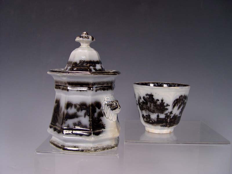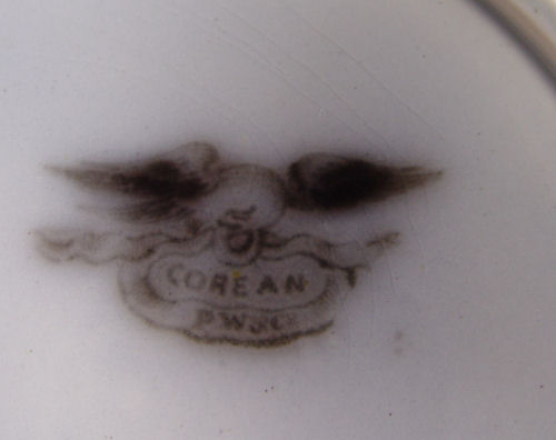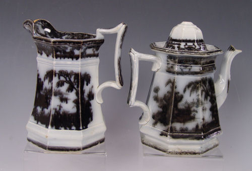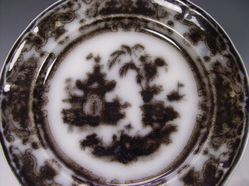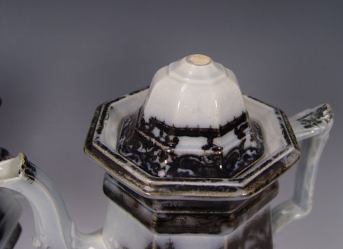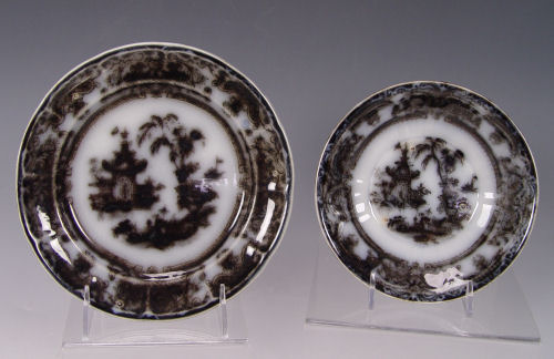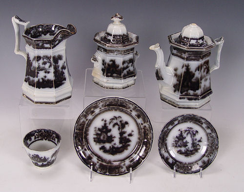 COREAN MULBERRY STAFFORDSHIRE STONEWARE: Podmore & Walker, Ca. 1834-1859. 37 pieces to include 9 dinner plates, 8 salad plates, 8 handleless cups, 9 bowl like saucers, milk jug, covered sugar and coffee pot. Please note finial loss on pot lid and some general wear to be expected in stoneware of this age.