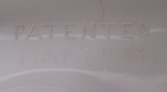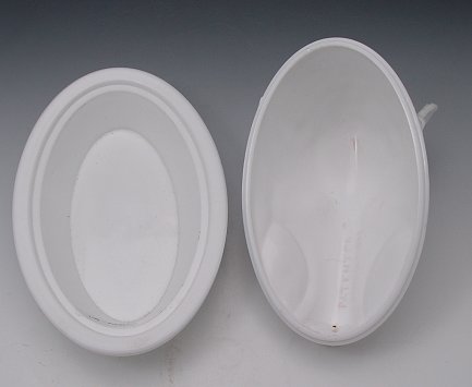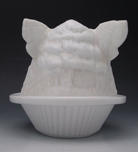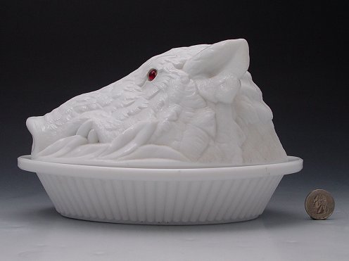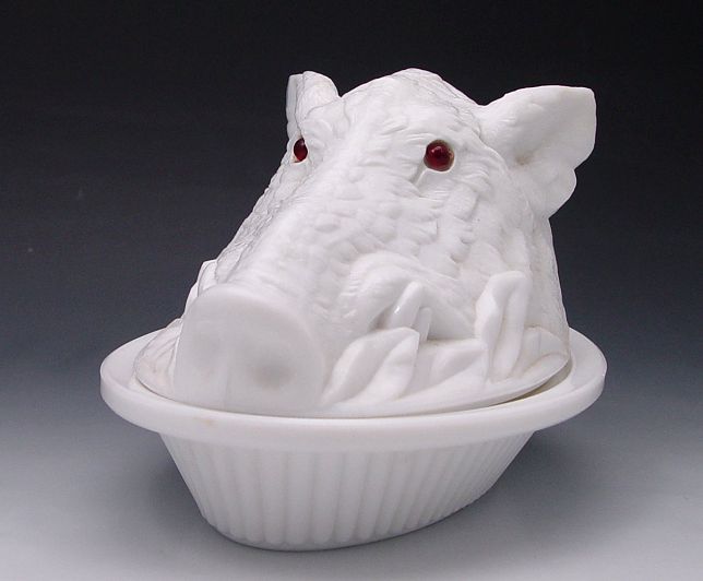 ATTERBURY BOARS HEAD COVERED ANIMAL DISH: Opaque white milk glass. Boar head on a ribbed base. Red glass eyes. Patented May 29 1888 in raised letters on base and lid. 5 1/2''h. x 9 1/4'' overall.